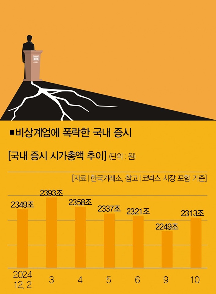 비상계엄 선포가 키운 정치적 불확실성에 코스피지수가 5.5% 하락한 것이다. 중소형 종목이 몰려있는 코스닥시장의 충격은 더 컸다. 같은 기간 코스닥지수는 690.80포인트에서 627.01포인트로 9.23% 하락했다.