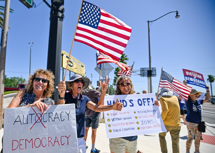 주말을 맞은 19일(현지시간) 미국 플로리다주 코코아에서 트럼프 행정부 정책에 반대하는 시민들이 ‘핸즈오프’(Hands Off·손 떼라) 푯말을 들고 시위를 벌이고 있다. <AFP 연합뉴스>