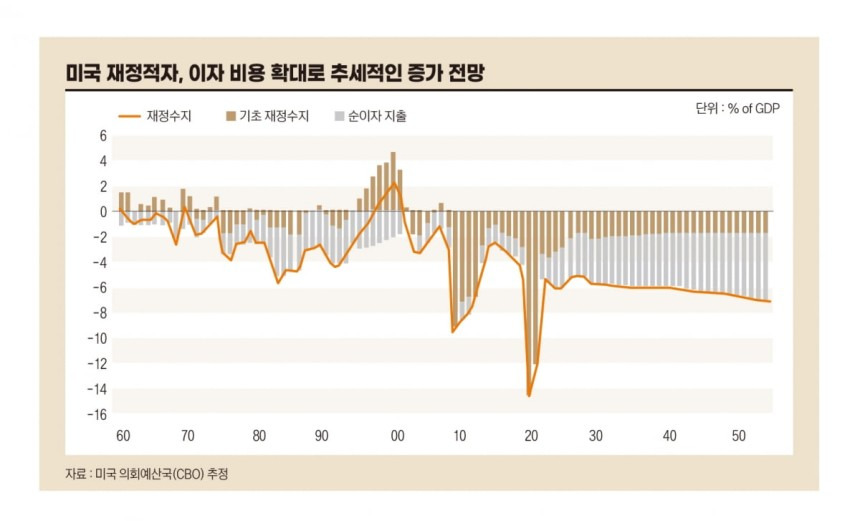 미 의회예산국(CBO)에 따르면 2024년 미국의 재정적자는 1.8조달러로 GDP의 6.4%에 달한다. GDP 대비 정부부채 비율은 2024년 98%에서 2034년 117%로 증가할 것으로 전망된다. 전쟁 중이었던 제2차 세계대전 당시 106%보다 많다. 트럼프 2기 행정부의 감세와 재정 확대가 반영되면 숫자는 더 악화된다.