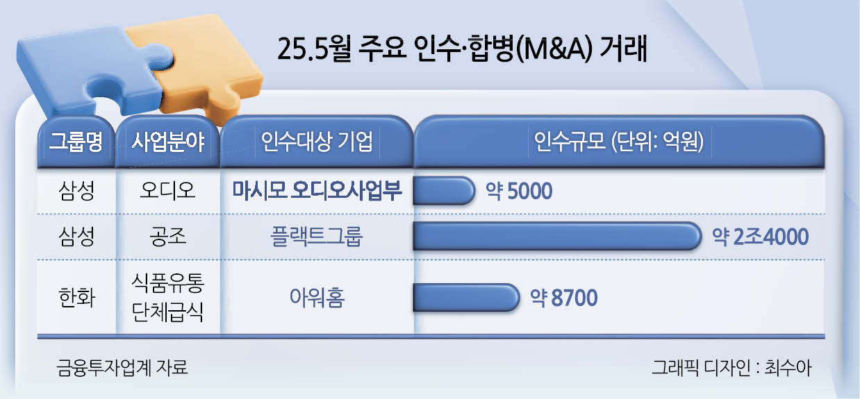 삼성전자가 이달에만 두 건의 대형 인수·합병(M&A)을 발표한 가운데 기업의 미래경쟁력 확보 움직임이 본격화했다는 평가가 나온다. 사모펀드 등 재무적투자자(FI)가 주춤한 사이 대형 거래를 성사시키며 기업들의 존재감이 부각되는 추세다.
