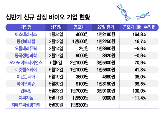 올해 바이오 신규 상장 기업은 증시 입성 후 성적표 역시 합격점을 받았다. 현재주가(6월 27일 종가) 기준 10개사(지에프씨생명과학 제외) 중 7개사가 공모가를 웃돈다. 지난해 상반기 말 공모가를 넘어선 기업이 전무했던 점과 상반된 분위기다.