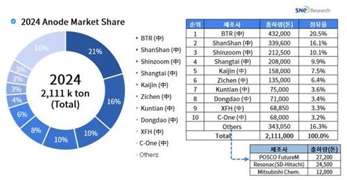 SNE리서치에 따르면 작년 출하량 기준 1∼10위가 모두 중국 기업들이었다. 합산 시장 점유율은 80%를 넘었다. 비중국 기업으로는 포스코퓨처엠이 11위(1.3%)를 기록해 순위가 가장 높았다.