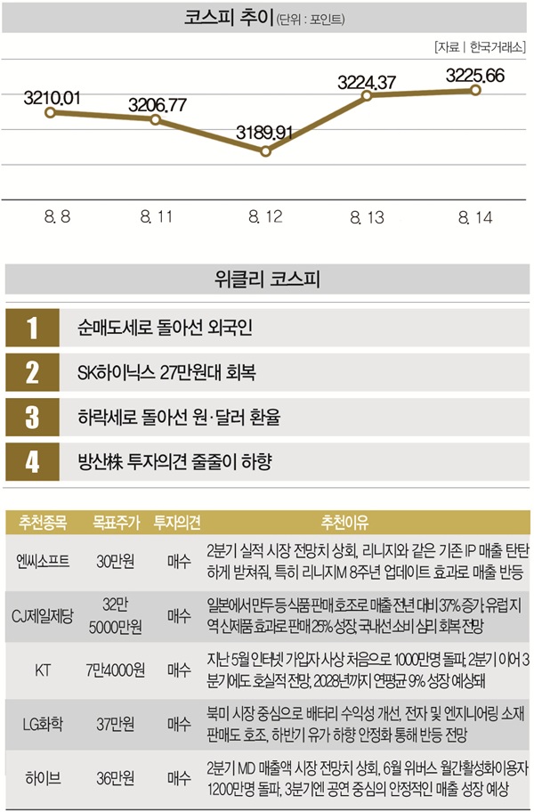 # 국내 증시가 소강 상태에 접어들었다. 코스피지수는 지난 7일 정부의 세제개편안 발표 충격에서 벗어나며 3200포인트대를 회복했다. 하지만 지난 8일~12일 3거래일 연속 하락하며 불안한 모습을 보였다. 코스피지수가 3거래일 이상 하락한 것은 올해 4월 2~7일(4거래일) 이후 4개월 만에 처음이었다. 13일 3200포인트대로 올라서고, 14일 이를 유지하는 데 성공했지만 아직은 불안하다. 개인투자자가 13~14일 2거래일 연속 순매도세를 기록한 데다 외국인 투자자도 순매수와 매도를 오락가락하고 있어서다.