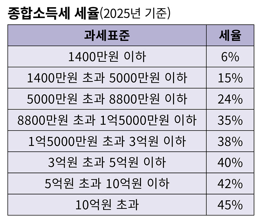 자본시장(증시)에서 비롯되는 몇 종류의 소득만 예외다. 앞서 살펴봤던 주식 양도차익은 아무리 많아도 절대다수는 양도세를 내지 않는다. ‘소득세법상 대주주’의 양도차익도 종합소득에 포함되지 않고 따로 징수되는 덕분에 비교적 낮은 세율을 적용받는다. 2000만원 이하의 배당소득 역시 실제 금액이 50만원이든 1990만원이든 14%만 내면 된다. 자본시장을 활성화하기 위해 제공하는 일종의 특혜다. 배당소득은 2000만원을 초과할 때 비로소 종합소득으로 합산되면서, 다른 소득들이 적용받는 원칙적이고 기본적인 ‘세율의 세계’로 진입하게 된다.