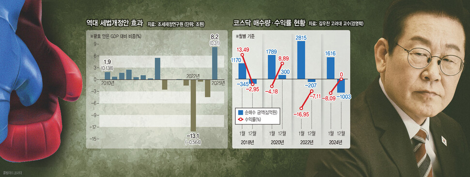이재명 정부의 조세개편안을 접했을 때의 나의 솔직한 인상은 변칙복서를 연상시킨다는 것이다. (중도) 진보와 (극우) 보수의 관성적 대립 구도에서 벗어난, 전례를 찾기 힘든 정책 조합이 담겨 있기 때문이다. 진보의 색채는 증세에서 드러난다. 무엇보다도 이번 개편안은 윤석열 정부가 깎아주었던 법인세율을 다시 되돌렸다. 그 결과 국내 법인에 적용되는 세율이 모든 과표구간에서 1%포인트씩 인상됐다. 국내 주식 증권거래세도 금융투자소득세 폐지 이전 수준인 0.2%로 복원되었고, 금융사의 1조원 초과 수익에 1.0%의 교육세를 부과하는 방식으로 ‘변형된 횡재세’도 들어왔다. 이를 통해 확보될 추가 세수는 연간 약 8.2조원. 2010년 이래 최대 규모의 증세다. 이는 말로는 ‘건전 재정’을 외치면서 실제로는 감세에 집착해 세수 확보에도 실패하고 성장 동력까지 고갈시킨 전임 윤석열 정부의 무능한 행보와 뚜렷하게 대비되는 모습이다.