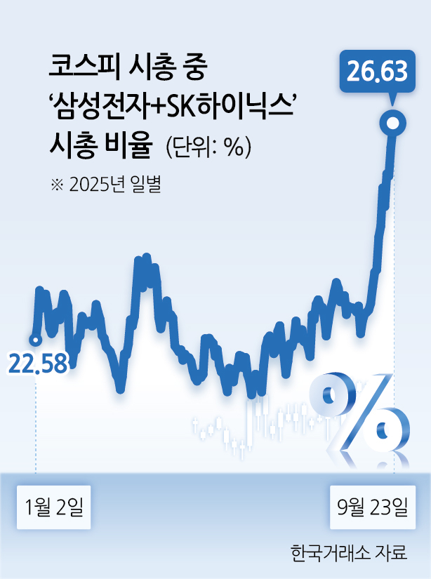 코스피 시총의 4분의 1 이상을 차지하고 있는 삼성전자와 SK하이닉스 두 종목의 강세는 코스피 ‘역대 최고가’ 행진을 맨 앞에서 이끄는 원동력으로 작용하고 있는 모양새다.