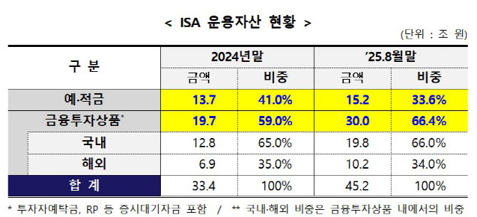 금융투자상품 내에서도 국내에 투자되는 상품의 비중이 증가했다. 지난해 말 ISA 내 금융투자상품(19조 7000억원)에서 국내 투자상품은 12조 8000억원으로 65.0%의 비중을 차지했으나 지난 8월 말 19조 8000억원으로 늘었다. 비중은 66.0%로 1.0%포인트가 증가했다. 반면 해외 투자상품은 규모가 같은 기간 6조 9000억원에서 10조 2000억원으로 늘었으나 그 비중은 35.0%에서 34.0%로 감소했다.