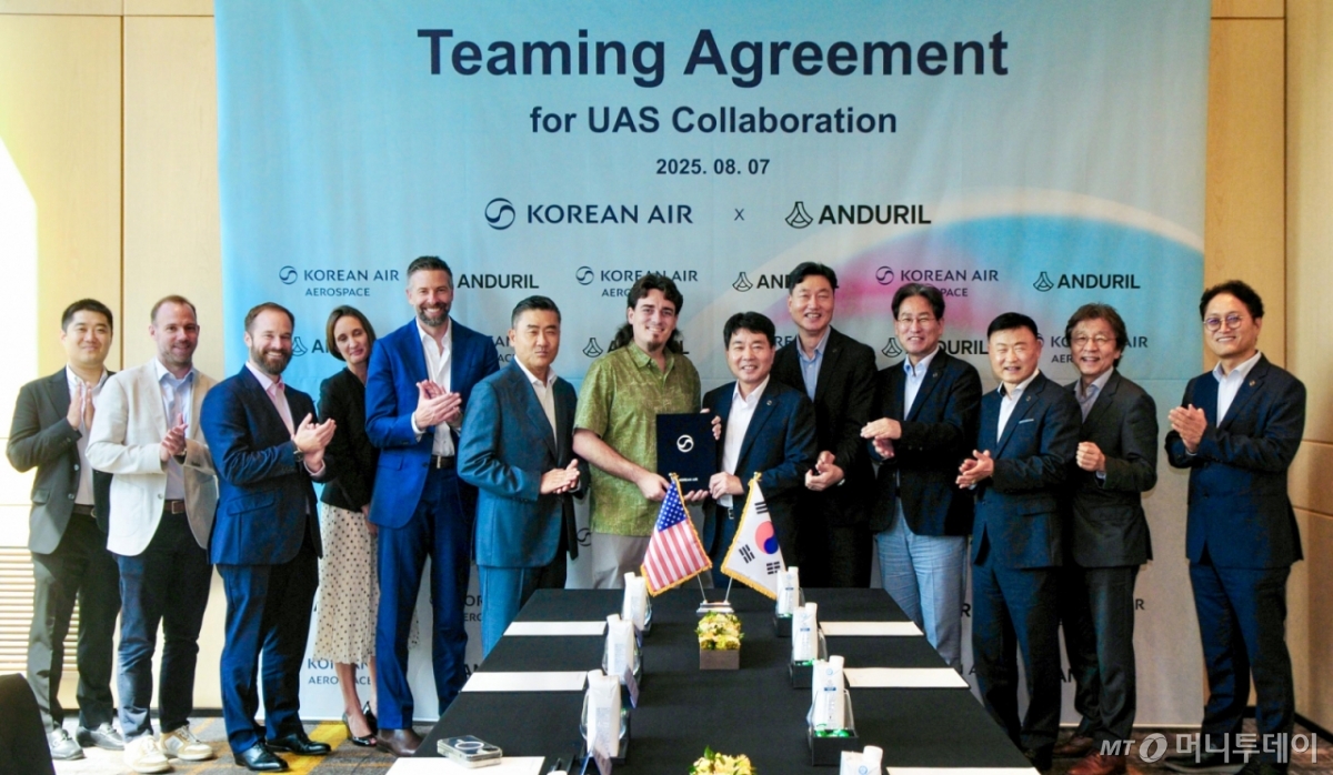 [서울=뉴시스] 임진규 대한항공 항공우주사업본부장과 팔머 럭키 안두릴(Anduril) 창업자가 8월 7일 서울 종로구 포시즌스호텔에서 한국 및 아시아·태평양 지역 무인 항공기 분야의 파트너십 구축을 위한 협력합의서에 서명 후 관계자들과 기념촬영 하고 있다. (사진=대한항공 제공) 2025.08.07. photo@newsis.com *재판매 및 DB 금지 /사진=류현주