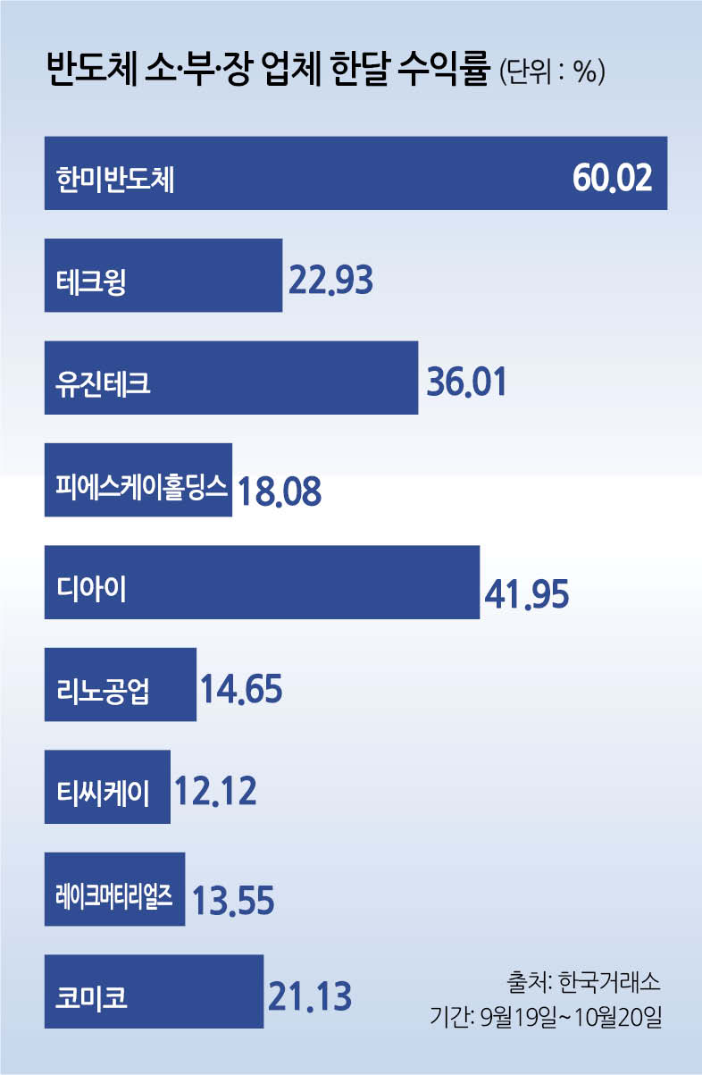 21일 한국거래소에 따르면 최근 한 달(9월19일~10월20일) 국내 주요 반도체 장비 업체 중 한미반도체(60.02%), 테크윙(22.93%), 유진테크(36.01%), 피에스케이홀딩스(18.08%), 디아이(41.95%) 등이 눈에 띄는 상승세를 보였다. 소재·부품 업체인 리노공업(14.65%), 티씨케이(12.12%), 레이크머티리얼즈(13.55%), 코미코(21.13%) 등도 두 자릿수 수익률을 기록하며 동반 강세를 나타냈다.