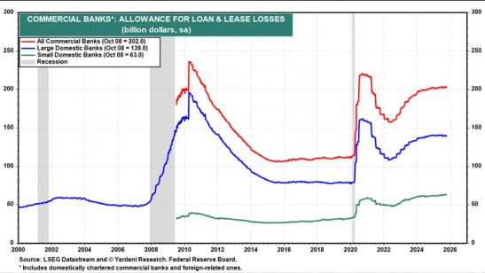 ① 지역은행 대출 부실과 사모대출 관련 우려에도 불구하고 시스템 전반의 건전성에 문제가 있다는 징후는 아직 발견되지 않고 있습니다. 야데니리서치는 과거 경기 침체 국면과 달리 미국 은행의 대손충당금이 비교적 안정적인 수준이라는 데 주목하고 있습니다.
