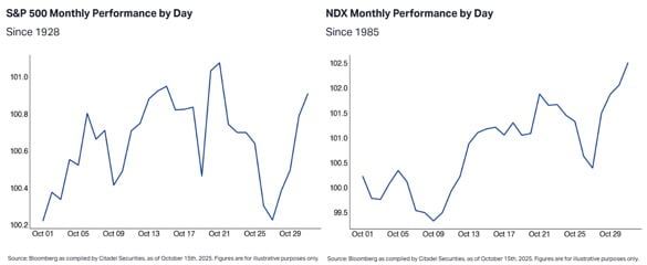 시타델증권의 주식 전략 헤드 스캇 럽너에 따르면 지난 100년 동안 S&P 500은 10월 26일, 나스닥 100은 10월 27일에 4분기 저점을 찍고 11월~12월에 반등하는 패턴을 보였습니다. 럽너는 이번에도 그런 계절성이 반복될 것으로 보면서 10월 말까지의 변동성과 단기 하락은 매수 기회가 될 수 있다고 조언합니다.