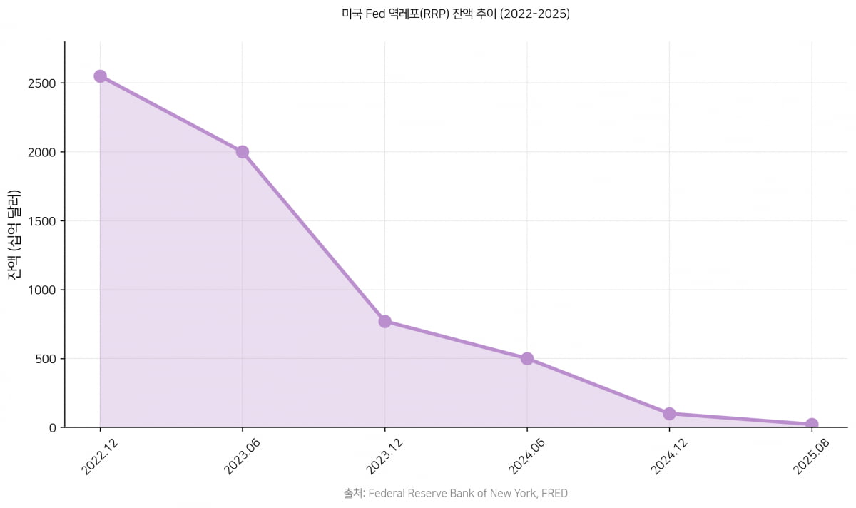 2023년 말만 해도 이 역레포에 예치된 돈이 2조 달러로 가장 높은 수준이었다. 머니마켓펀드(MMF)가 여유 자금을 잠시 맡기는 거대한 저수지로 기능했다. 하지만 이 저수지는 Fed의 양적 긴축(QT)과 미국 재무부의 단기국채(T-bill) 발행 증가가 맞물리며 빠른 속도로 말라갔다.