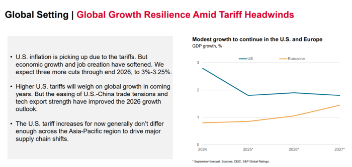 글로벌 경제가 관세 장벽 등 무역 역풍 속에서도 완만한 회복세를 보일 것으로 예상되는 가운데, 미국과 유로존의 경제 성장률은 2027년까지 2%를 밑도는 저성장 기조를 이어갈 전망이다. [자료=S&P 글로벌]