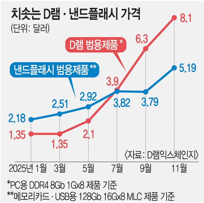 인공지능(AI) 서버와 데이터센터가 메모리 생산 능력을 빨아들이면서 스마트폰과 노트북, 게임기 제조 업체의 고민이 깊어지고 있다. 기존에 사용하던 칩을 그대로 가져가려면 제품 가격을 인상해야 하고, 가격을 동결하려면 제품 사양을 낮춰야 하는 상황이다. 특히 스마트폰 경우 내년 가격이 평균 7% 뛸 것으로 예상되면서 “올해가 가기 전에 사야 한다”는 심리가 확산되고 있다.