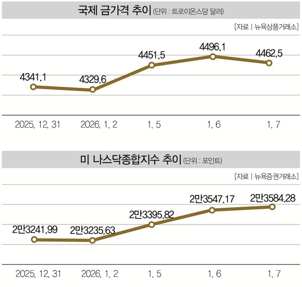 #채권 = 채권 금리는 소폭 하락(가격 상승)했다. 2025년 12월 31일 2.95%였던 국고채(3년물) 금리는 지난 7일 2.91%로 0.04%포인트 떨어졌다. 회사채(3년물) 금리도 같은 기간 3.47%에서 3.42%로 하락했다. 2026년 첫 기준금리 결정을 앞두고 금리 인하 기대감이 높아졌기 때문이다. 한국은행 금융통화위원회는 1월 15일, 미 연방준비제도(연준·Fed)의 연방공개시장위원회(FOMC)는 27일(현지시간)에 열릴 예정이다.