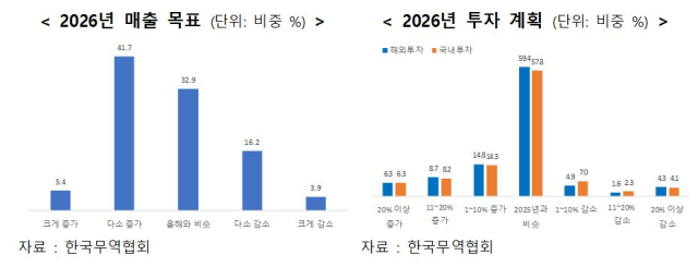 올해 수출기업들의 투자도 활성화될 것으로 전망된다. 응답 기업의 47.1%가 전년 대비 매출 목표를 높게 설정하며 도전적인 경영 의지를 내비쳤다. 투자 계획 역시 국내·해외투자 모두 전년 수준을 유지하거나 확대하겠다는 응답이 80%를 웃돌아 불확실성 속에서도 투자를 지속하겠다는 의지를 드러냈다.