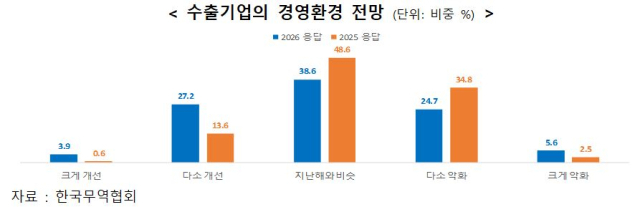 한국무역협회 국제무역통상연구원이 21일 발간한 ‘수출기업의 2026년 경영환경 전망’ 설문조사 보고서에 따르면, 우리 수출기업의 38.6%는 올해 경영환경이 전년과 ‘비슷할 것’으로 응답했다. 또 31.1%는 ‘개선될 것’으로, 30.3%는 ‘악화될 것’으로 봤다.