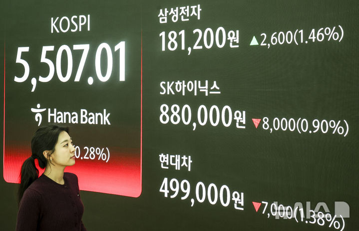 [서울=뉴시스] 정병혁 기자 = 13일 서울 중구 하나은행 딜링룸 전광판에 코스피 등 시황 정보가 나타나 있다. 이날 코스피는 전 거래일(5522.27)보다 15.26포인트(0.28%) 하락한 5507.01에, 삼성전자는 2600원 오른 18만1200원에, SK하이닉스는 8000원 내린 88만원에 거래를 종료했다. .2026.02.13. jhope@newsis.com[서울=뉴시스] 박주연 기자 =