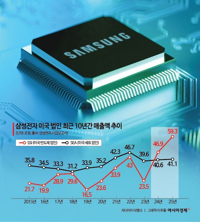 SEA) 매출 41.1조원보다 18.2조원가량 큰 것으로 파악됐다. 전년 대비 26.5% 증가한 결과다. 이는 지난 2024년 반도체 법인 매출액이 46.9조원으로 세트 법인 매출액 40.6조원을 처음 넘어선 이후 '크로스오버'가 지속되고 있는 것으로 보인다.