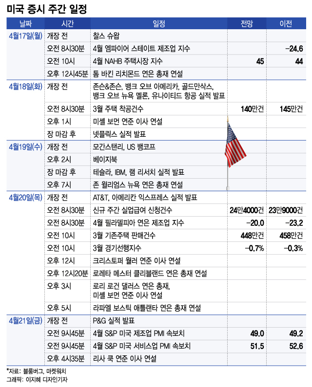 오는 21일 발표되는 S&P의 4월 제조업 및 서비스업 구매관리자 지수(PMI)도 주목할 필요가 있다. 시장은 여전히 올해 안에 연준이 금리를 인하할 것으로 기대하고 있는데 경제가 얼마나 빠르게 둔화하는지가 금리 인하를 결정할 핵심 변수이기 때문이다.