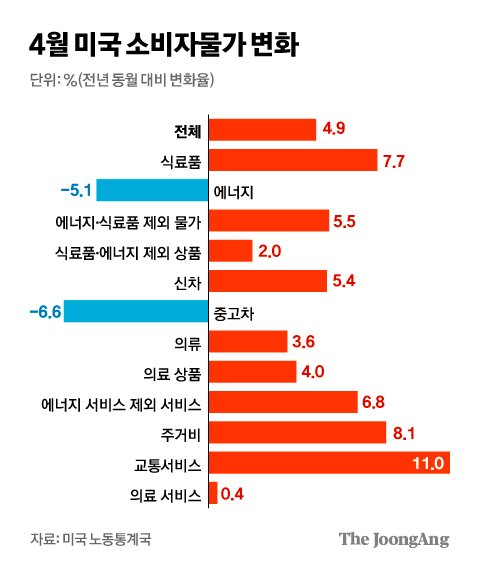 근원물가 상승세를 이끄는 주거비(shelter)도 고정금리 비중이 높다 보니 기준 금리 인상 효과가 덜 나타나고 있다. 실제 지난달 주거비는 전년 대비 8.1% 상승했는데, 3월(8.2%)과 비슷한 수준이다. 이마저도 다시 상승 폭을 확대할 가능성이 있다. 지난달 발표한 2월 ‘S&P 케이스-실러 주택가격지수’가 전달보다 0.3% 오르며 7개월 만에 상승 전환해서다. 케이스-실러 지수는 미국의 대표적 부동산 가격 지수로, 이 지수가 오르면 시차를 두고 주거비도 오른다.