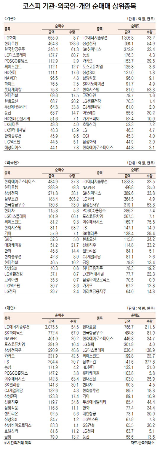 기관은 LG화학(051910)(655억원)을 가장 많이 순매수한 가운데 현대로템(064350)(465억원), 한국항공우주(047810)(348억원), LG디스플레이(034220)(138억원), POSCO홀딩스(005490)(113억원), 씨에스윈드(112610)(112억원), HD현대(267250)(111억원), NAVER(035420)(97억원), 하이브(352820)(77억원), 롯데케미칼(011170)(75억원), 현대건설(000720)(70억원), 한화오션(042660)(69억원), 두산에너빌리티(034020)(65억원), 풍산(103140)(64억원) 등을 매수했다. 순매도 상위종목은 LG에너지솔루션(1307억원)을 비롯해 삼성전자(005930)(391억원), SK하이닉스(373억원), 농심(176억원), 카카오(154억원), 포스코퓨처엠(136억원), 삼성SDI(127억원), 삼양식품(96억원), SK이노베이션(92억원), 한화시스템(272210)(81억원), 고려아연(80억원), LG생활건강(70억원), CJ제일제당(61억원), 아모레G(56억원) 등을 팔았다.