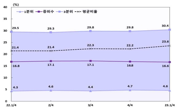 기업 규모별로 나눠 보면 대기업은 24.1%에서 25.0%로 상승했다. 반면 중소기업은 30.6%에서 30.2%로 하락했다.