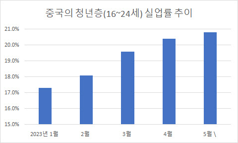 가장 큰 고통은 고용에서 나타나고 있다. 중국의 5월 청년(16~24세) 실업률은 20.8%로 역대 최고치를 기록했다. 라디 선임연구원은 “1978년에서 2020년까지 모든 고용은 민간 부분에서 생겨났는데 이제 민간은 투자도 안하고 고용도 안한다”며 “대학을 졸업한 청년들이 기대했던 직업을 가질 수 없게 됐다”고 설명했다. 이에 따라 중국 경제는 잠재성장률을 하회하고 있다.