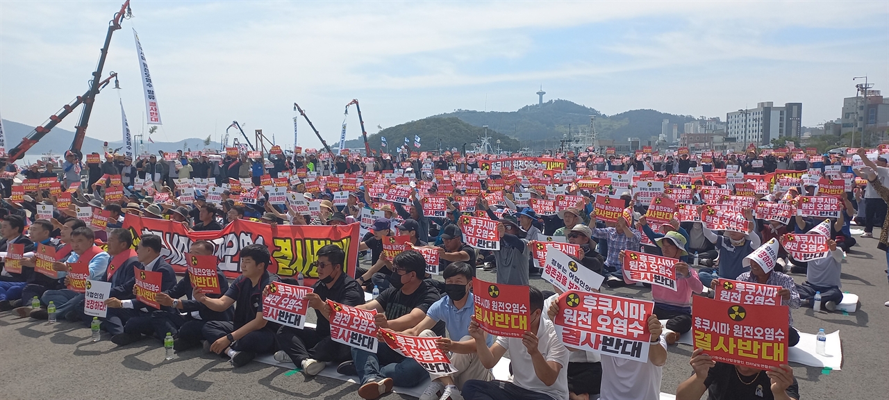 부두에선 후쿠시마 원전 오염수 방류를 강행하려는 일본 정부와 이에 대한 분명한 반대 입장을 내놓지 않는 우리 정부를 규탄하는 어민들의 성난 목소리가 쉴새 없이 울려퍼졌다.