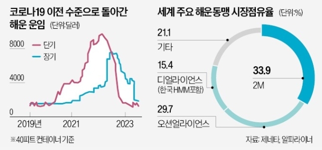 해운 동맹은 특정 항로에 정기 취항하는 선사들의 카르텔이다. 서로의 선박을 매입, 교환 등의 방식으로 공유한다. 새 선박을 직접 투입하지 않아도 고객에게 더 많은 항로 서비스를 제공할 수 있는 게 이점이다. 공동 물량 관리와 적재로 비용을 절감할 수 있다. 다양한 해운 동맹 중 최대 규모인 2M은 세계 컨테이너 운송량의 3분의 1가량을 차지하며 막강한 시장 지배력을 행사했다.