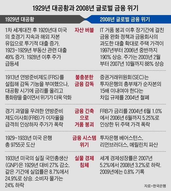 대공황과 글로벌 금융위기는 이처럼 전개 흐름과 핵심 원인에서는 '반복된 역사'이지만, 미시적인 요인이나 위기의 규모 면에서는 차이가 있다. 대공황의 교훈을 경험한 인류가 금융 시스템의 약점을 보완했기 때문이다. 먼저 대공황은 1차 세계대전 이후 금본위제(화폐 가치를 금의 가치로 나타내는 것)에 복귀한 많은 나라가 금본위제에 발목을 잡혀 통화긴축정책을 쓰게 되고 여기에 미숙한 은행 시스템이 제대로 위기 대응을 하지 못하면서 발생했다. 반면 글로벌 금융위기는 금본위제가 폐지된 상황에서 고위험 고수익 금융파생상품이 급속히 확산됐지만 금융 감독 당국이 제대로 대응하지 못해 폭발했다. 애덤 투즈 교수는 "규제 완화, 법인세 인하, 자유무역 등을 핵심 가치로 여기는 신자유주의의 부작용이 드러난 것"이라고 분석했다.