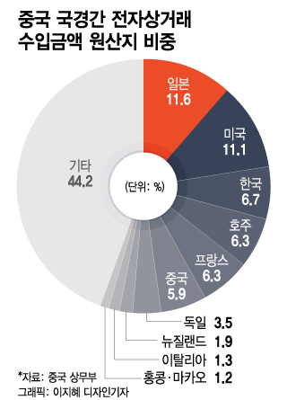 국경간 전자상거래 수입 시장에서는 일본(11.6%), 미국(11.1%)에 이어 한국(6.7%)이 3위를 차지했다. 원산지 비중으로 분석한 결과인데, 우리나라가 중국으로 수출하는 화장품, 의류 등의 영향으로 보인다.