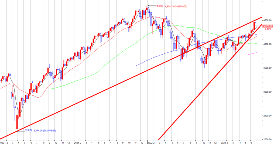 특히나 S&P500 주봉으로 본 그림은 3년의 흐름 동안 만들어 진것이서 그 폭발력이 어느 정도 두려워할만했는데 그것이 지나가면 언제 다시 그 기회(?)가 올지는 아무도 모릅니다.