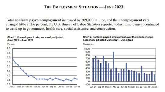 이날 미국 노동부 고용통계국이 밝힌 지난 6월 비농업 부문 일자리는 20만9000개 증가세로 나타났다. 전일 민간정보업체 ADP(Automatic Data Processing)가 집계한 49만7000개 보다는 28만8000개 적은 숫자다. 2020년 12월 이후로는 가장 낮은 증가폭이다.