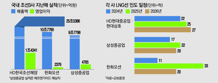 HD현대중공업과 HD현대삼호는 지난해 LNG선 22척을 인도했다. 올해는 이보다 3척 많은 25척의 LNG선 인도가 예정돼 있다. 삼성중공업과 한화오션도 올해 각각 22척, 33척의 LNG선을 인도할 것으로 전망된다.